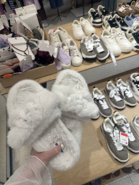 キャラものなのに子供っぽすぎなくて、ちゃんとおしゃれなのがすごい!!!!スニーカーも可愛かったし、アクセサリーも種類が多くて見てるだけで楽しい空間でした!!中でも一番心を掴まれたのは、シナモロールのふわふわスリッパ♡♡♡♡もこもこで優しい色合いが可愛すぎて、思わず立ち止まって見ちゃいました!