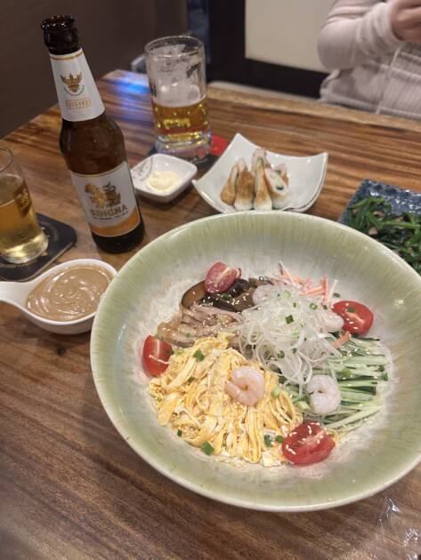 暑いタイで食べる冷やし中華は最高で、つるっと食べられて体が少し生き返った感じがしました!一緒にビールも頼んで、これがまた合う!!最高👍
